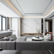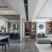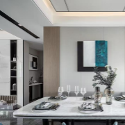 用它装点空间,无需繁复设计便自带气质。客厅选灰调豆沙粉墙面,搭配米白亚麻沙发,浅灰地毯铺陈脚下,三色交融间,柔和得让人卸下疲惫;餐厅的灰蓝色餐边柜,与同色系陶瓷餐具呼应,金属细框吊灯添一丝精致,却不打破整体的静谧。
