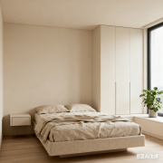 点睛之笔是“呼吸感”:大面积落地窗引入天光,薄纱帘滤去强光,让阳光在墙面、家具上流动;角落摆一盆琴叶榕,鲜绿叶片与空间的素净碰撞,添了生机却不杂乱。