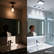 紧凑布局 “洗漱 + 马桶 + 淋浴隔断”,选折叠门节省空间,满足客人及家人基础需求,避免浪费面积。